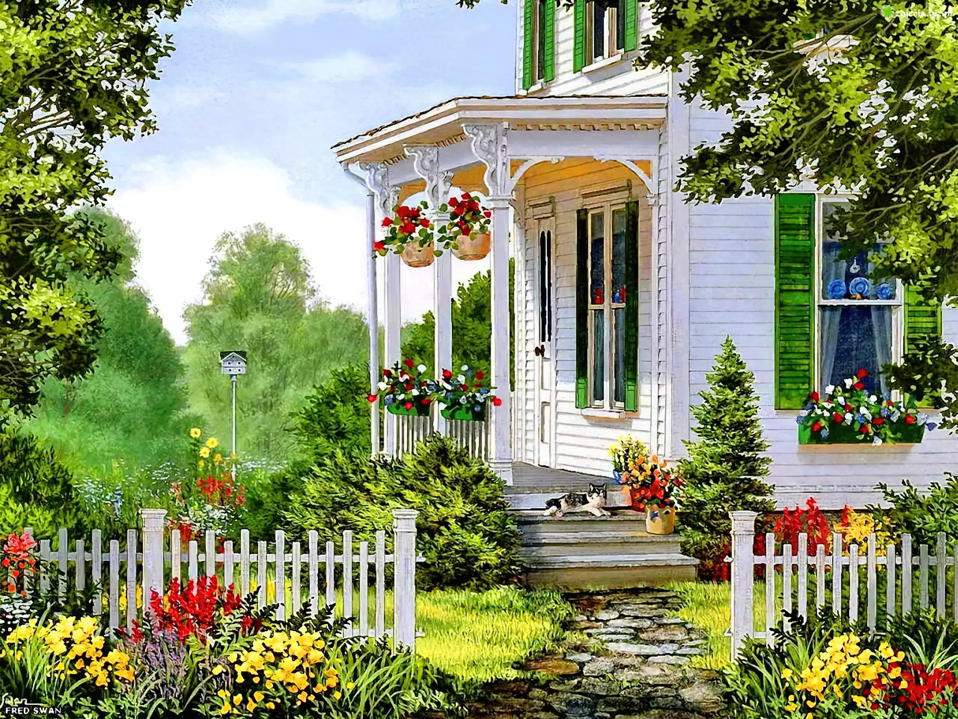 Zdjęcie Biały, Dom, Płot, Ogród, Kwiaty