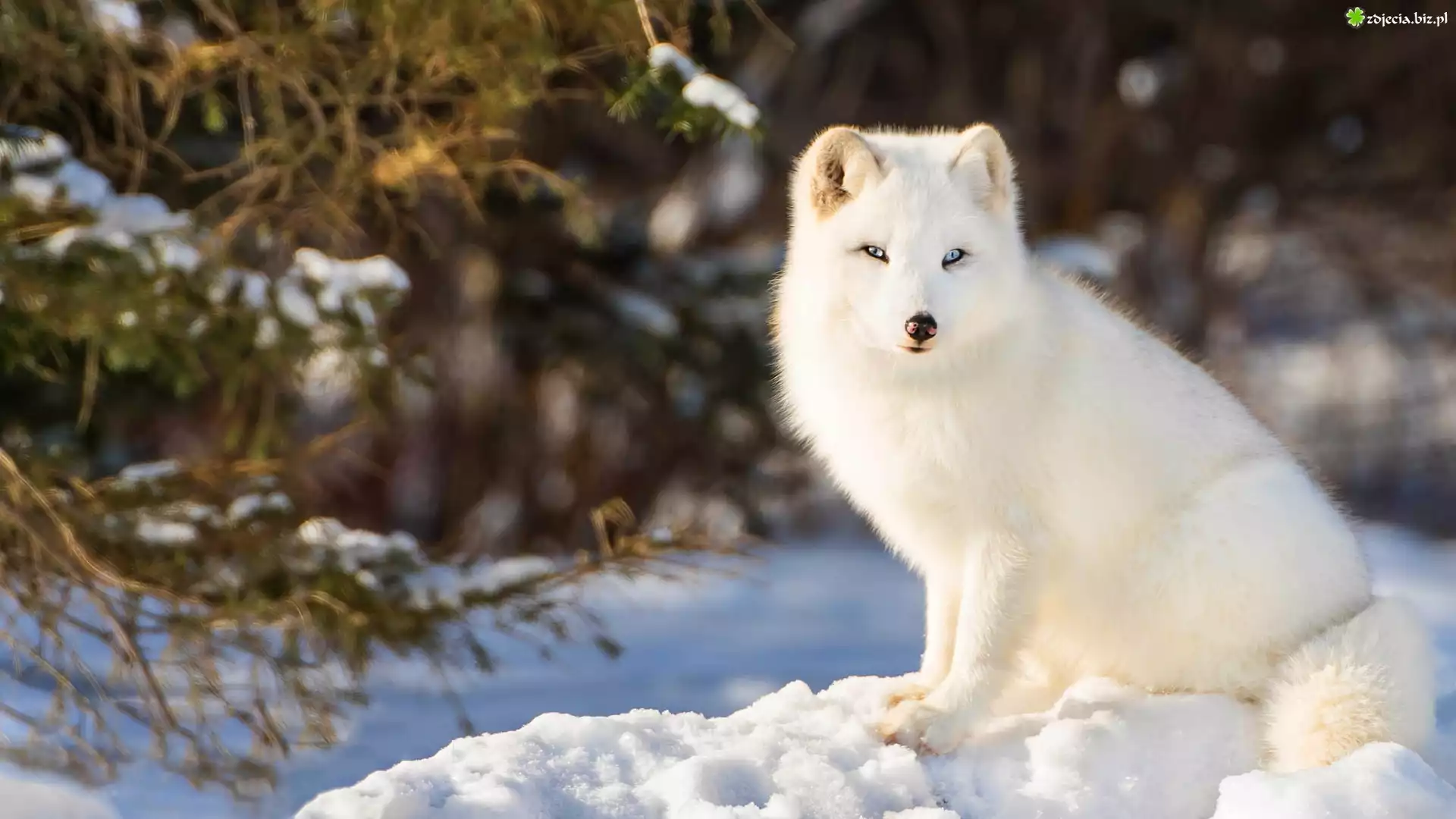 Zdjęcie Biały, Lis polarny, Śnieg, Rozmyte, Gałązki