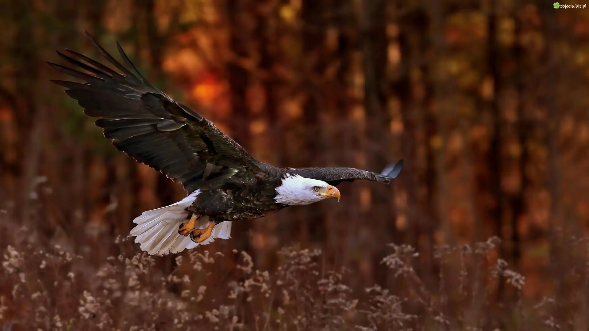 Zdjęcie, Bielik amerykański, Lot, Trawy, Las