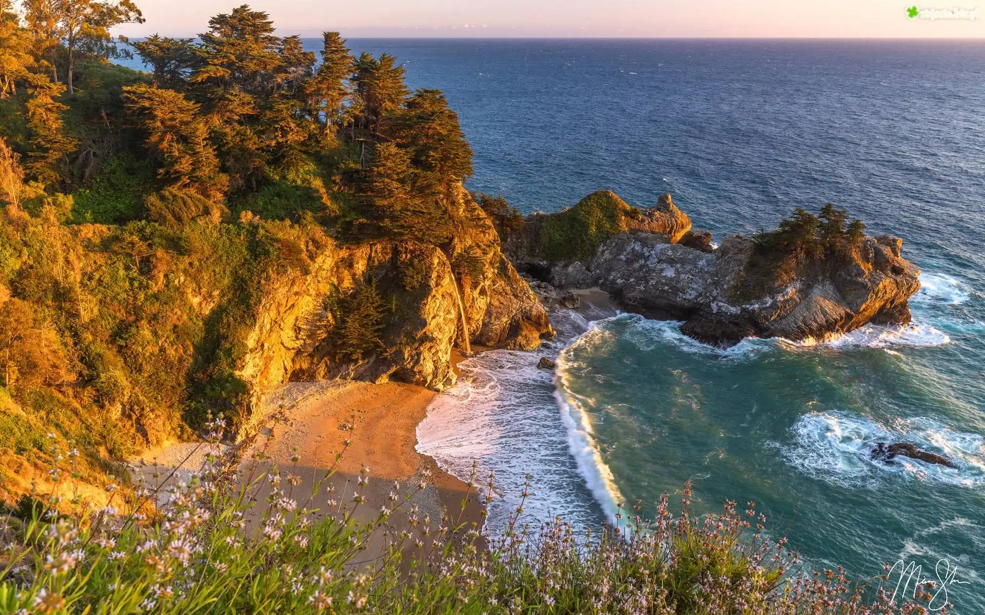 Zdjęcie Wybrzeże Big Sur, Park Stanowy Julia Pfeiffer Burns, Wodospad, McWay Falls, Morze, Zatoka, Plaża, Skały, Trawa, Drzewa, Kalifornia, Stany Zjednoczone |