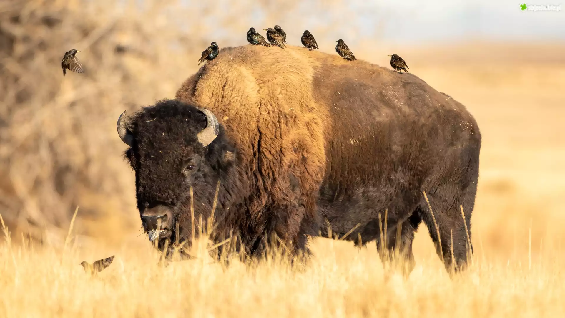 Zdjęcie, Bizon, Ptaki, Szpaki