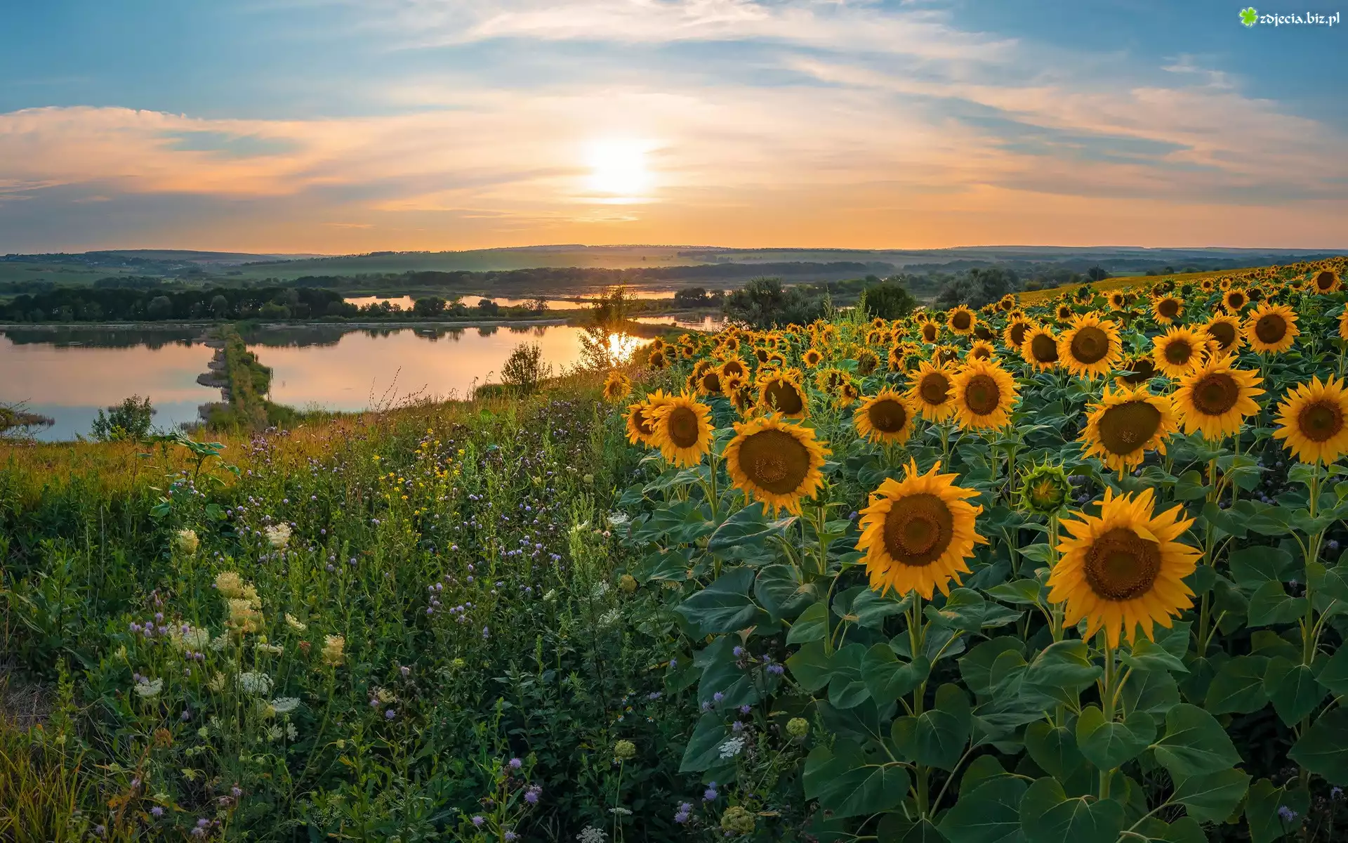 Zdjęcie Pole, Kwiaty, Słoneczniki, Jezioro, Niebo, Lato, Słoneczny blask