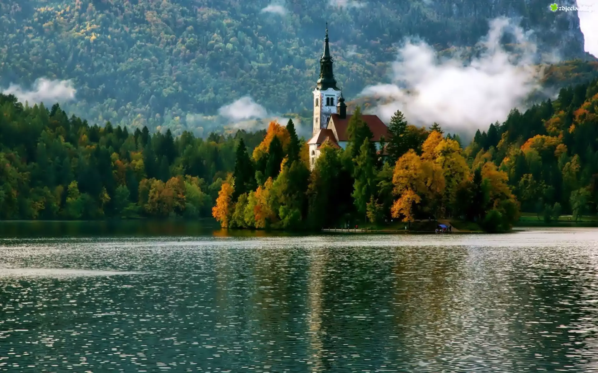 Zdjęcie Jezioro, Bled, Las, Mgła, Kościół, Jesień, Słowenia