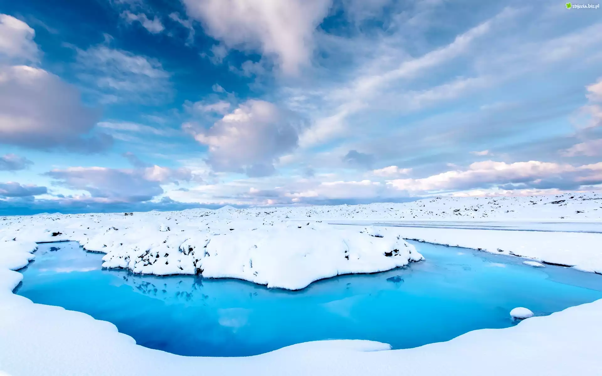 Zdjęcie Islandia, Błękitna Laguna, Źródła geotermalne, Lód, Chmury, Zima