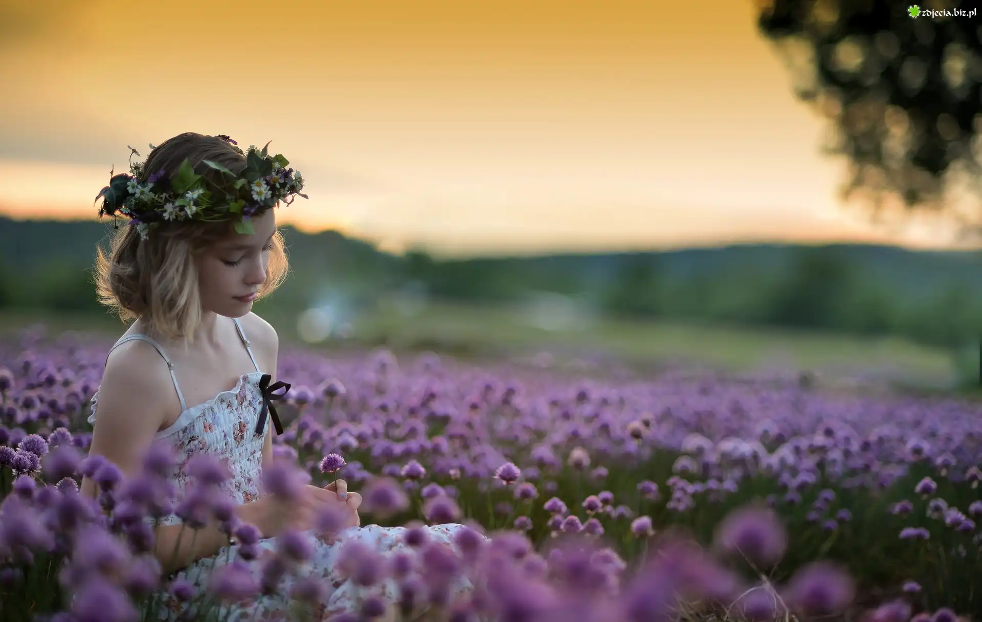 Zdjęcie Blondwłosa, Dziewczyna, Wianek, Łąka, Kwiaty