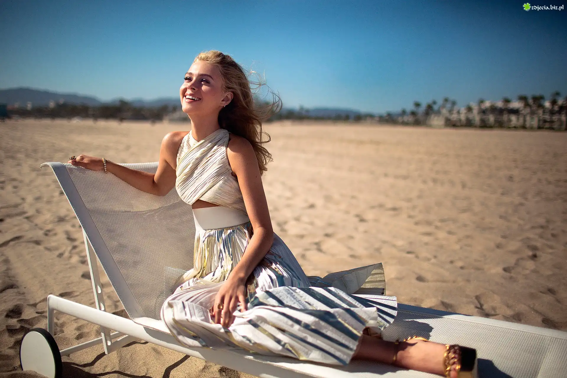 Zdjęcie, Blondynka, Nicola Peltz, Uśmiech, Plaża, Leżak, Wakacje