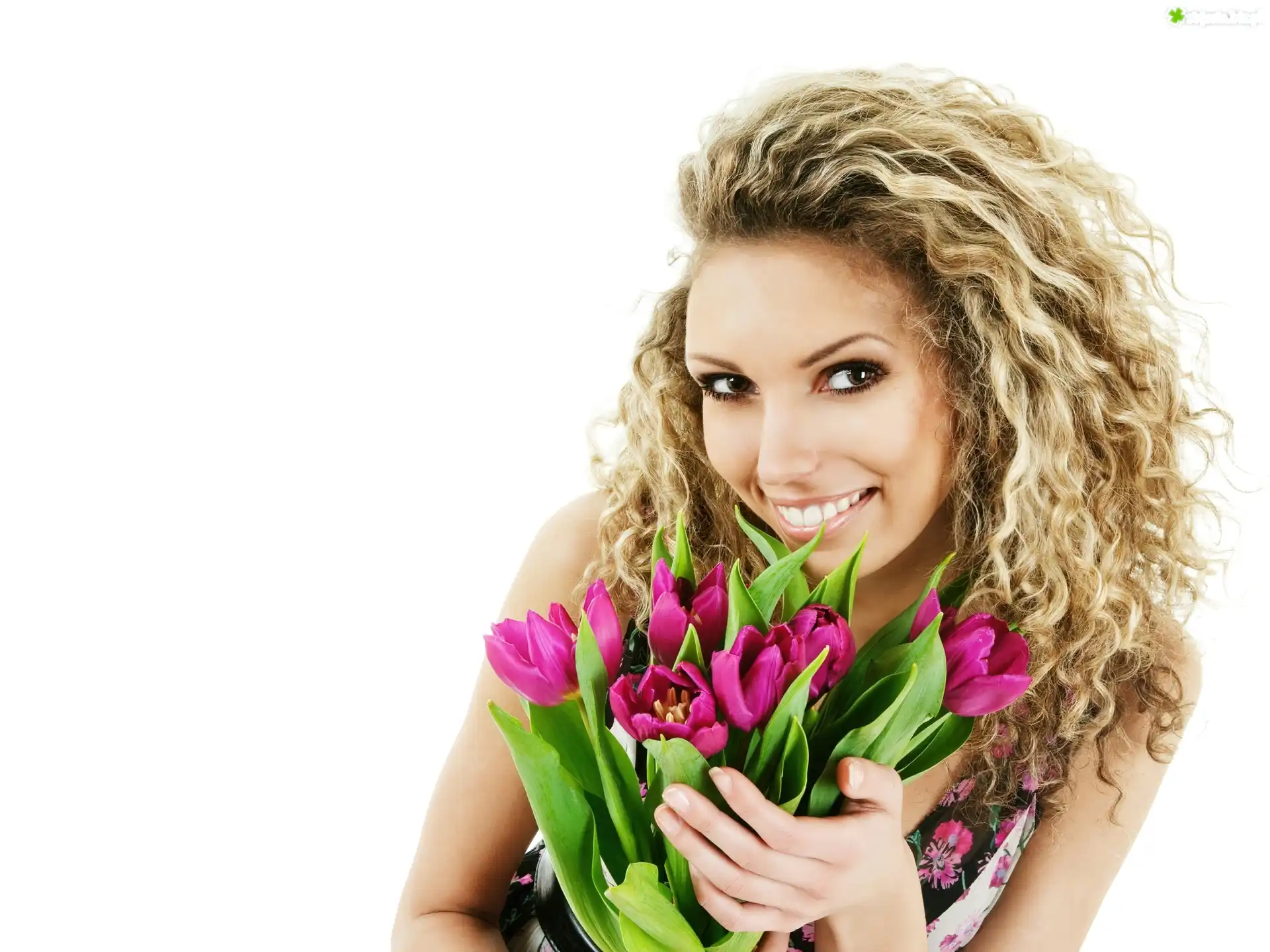 Zdjęcie Blondynka, Bukiet, Tulipanów, Uśmiech