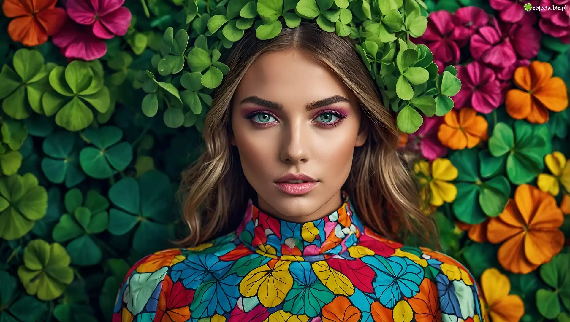 Zdjęcie Twarz, Dziewczyna, Kobieta, Makijaż, Kwiaty, Kolorowe, Koniczyna, Bluzka