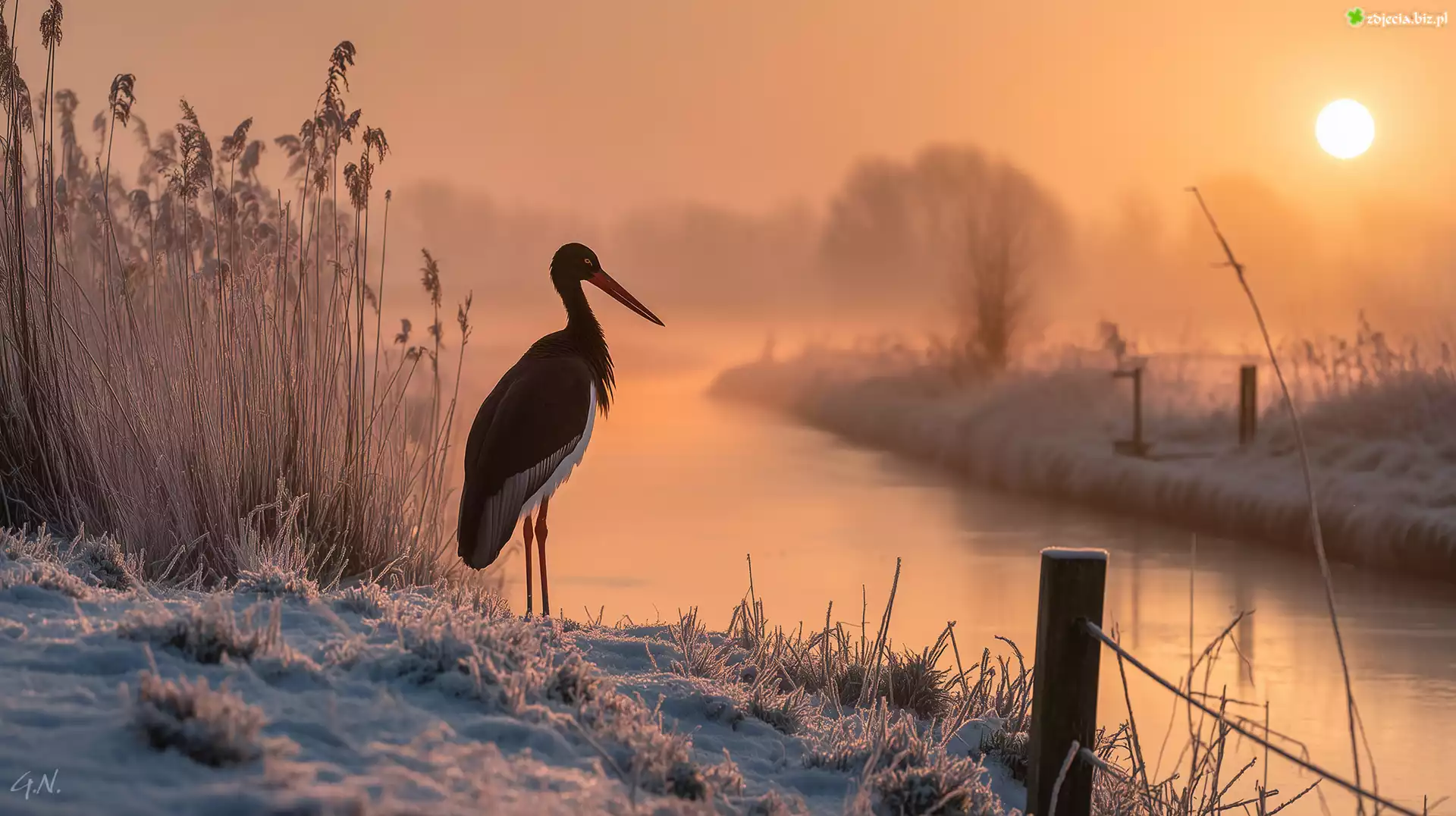 Zdjęcie Bocian czarny, Rzeka, Oszronione, Trawy, Zima, Zachód słońca, Grafika Ai