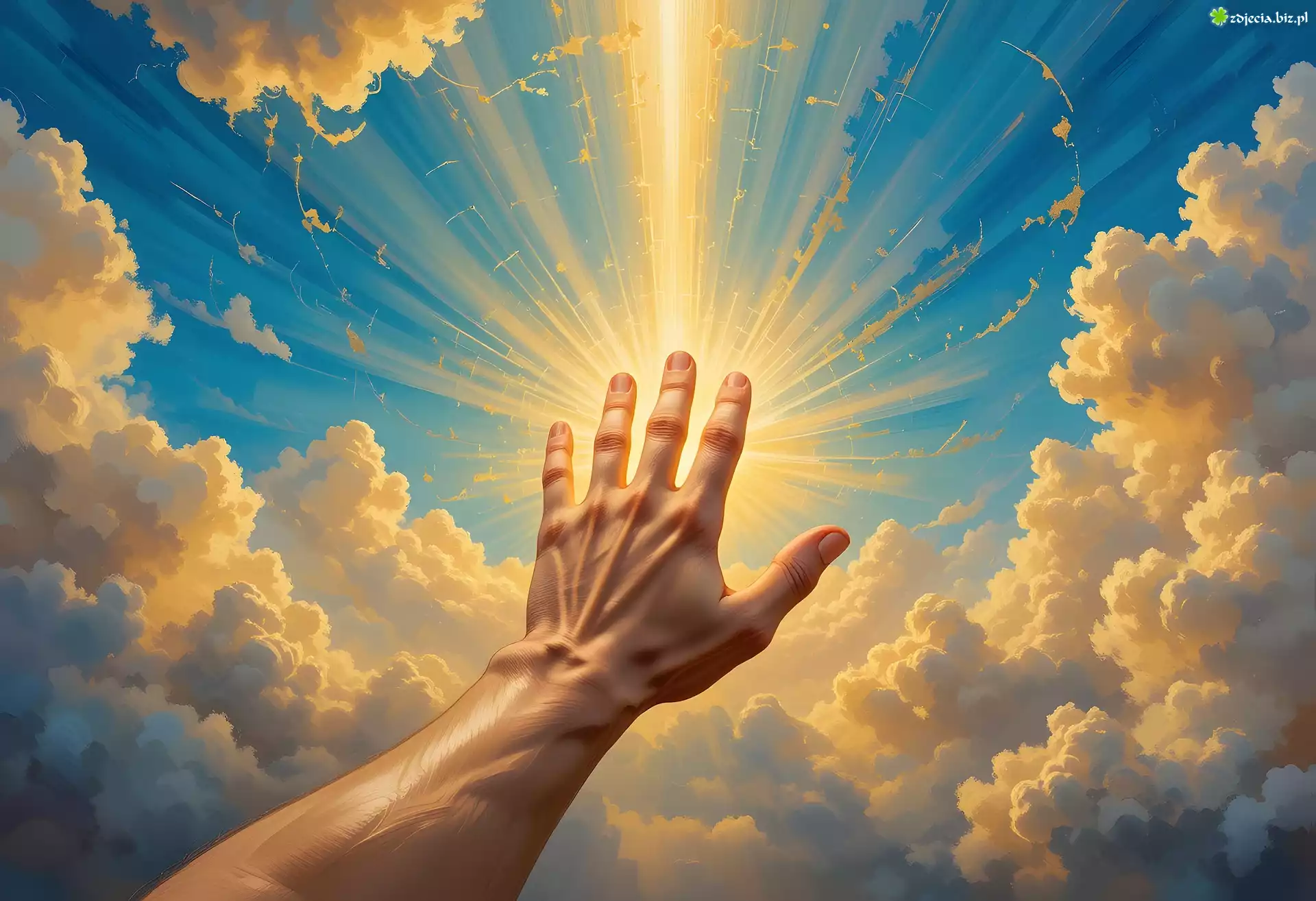 Zdjęcie Grafika, Komputerowa, Dłoń, Ręka, Palce, Religia, Wiara, Nadzieja, Bóg, Duchowość, Dotyk, Słońce, Promienie, Chmury |