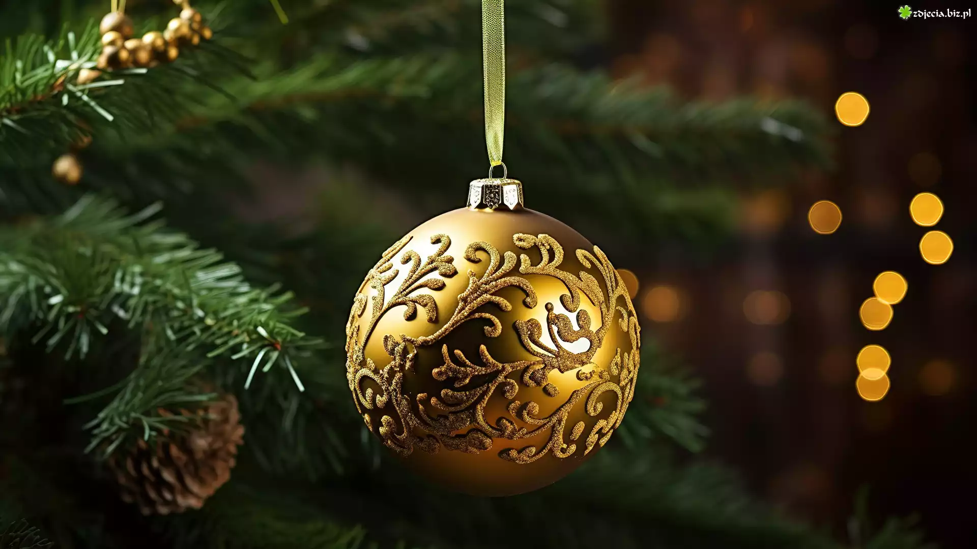 Zdjęcie Boże Narodzenie, Złota, Bombka, Gałązki, Świerkowe, Światełka