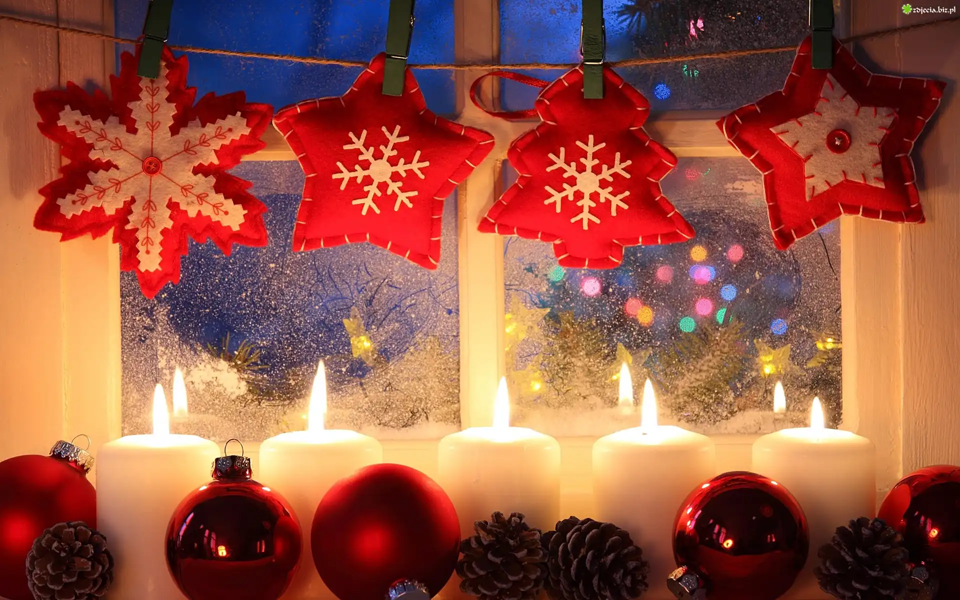 Zdjęcie Czerwone, Bombki, Białe, Świece, Okno, Święta, Dekoracja