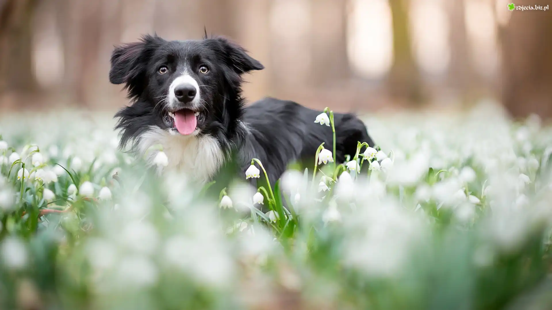 Zdjęcie Pies, Border collie, Mordka, Łąka, Kwiaty, Śnieżyce