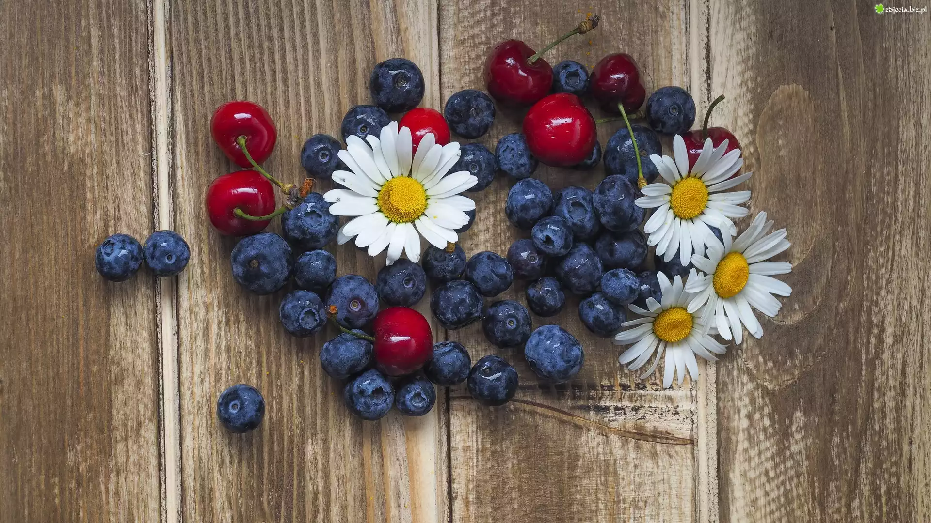Zdjęcie Borówki, Wiśnie, Kwiaty, Rumianki, Deski