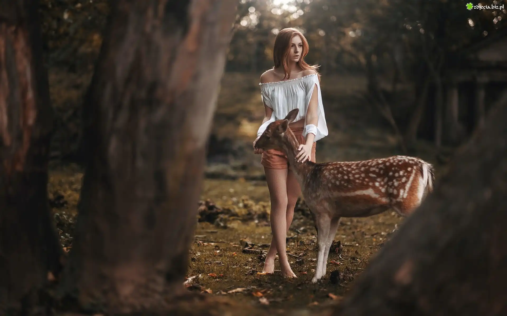 Zdjęcie Kobieta, Bosa, Las, Drzewa, Gałęzie, Ściółka, Sarna