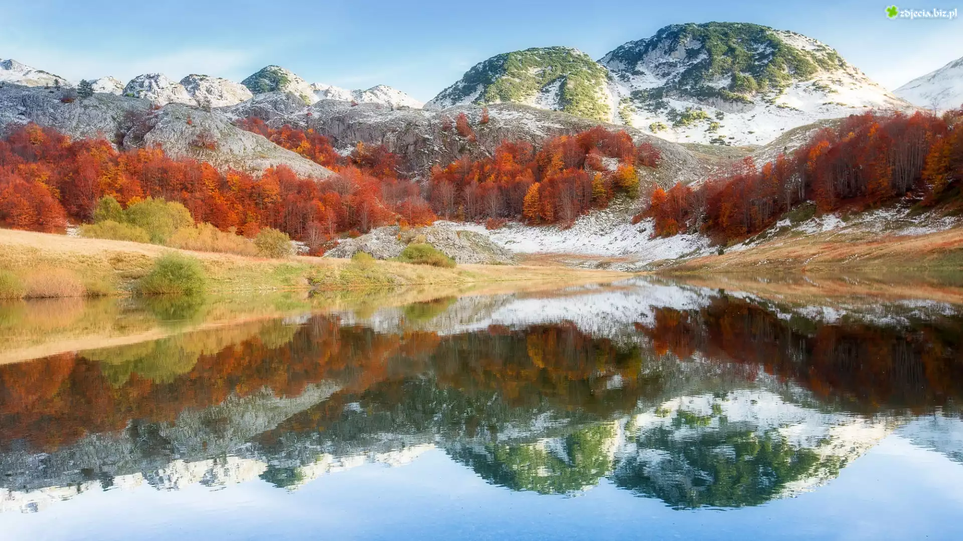 Zdjęcie Bośnia i Hercegowina, Park Narodowy Sutjeska, Masyw górski Zelengora, Góry Dynarskie, Jezioro Orlovacko, Jesień, Las, Drzewa, Odbicie |