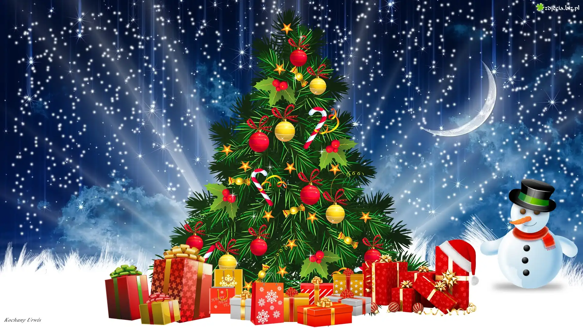 Zdjęcie Boże Narodzenie, Choinka, Prezenty, Bałwan, Księżyc