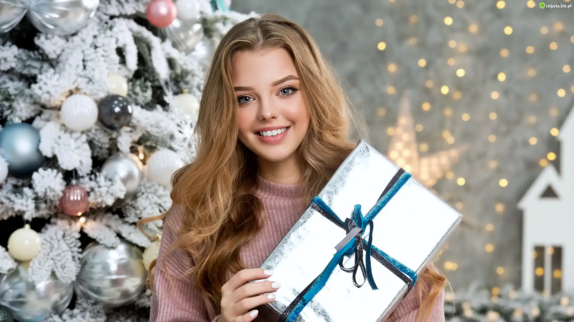 Zdjęcie Boże Narodzenie, Dziewczyna, Blondynka, Choinka, Prezent