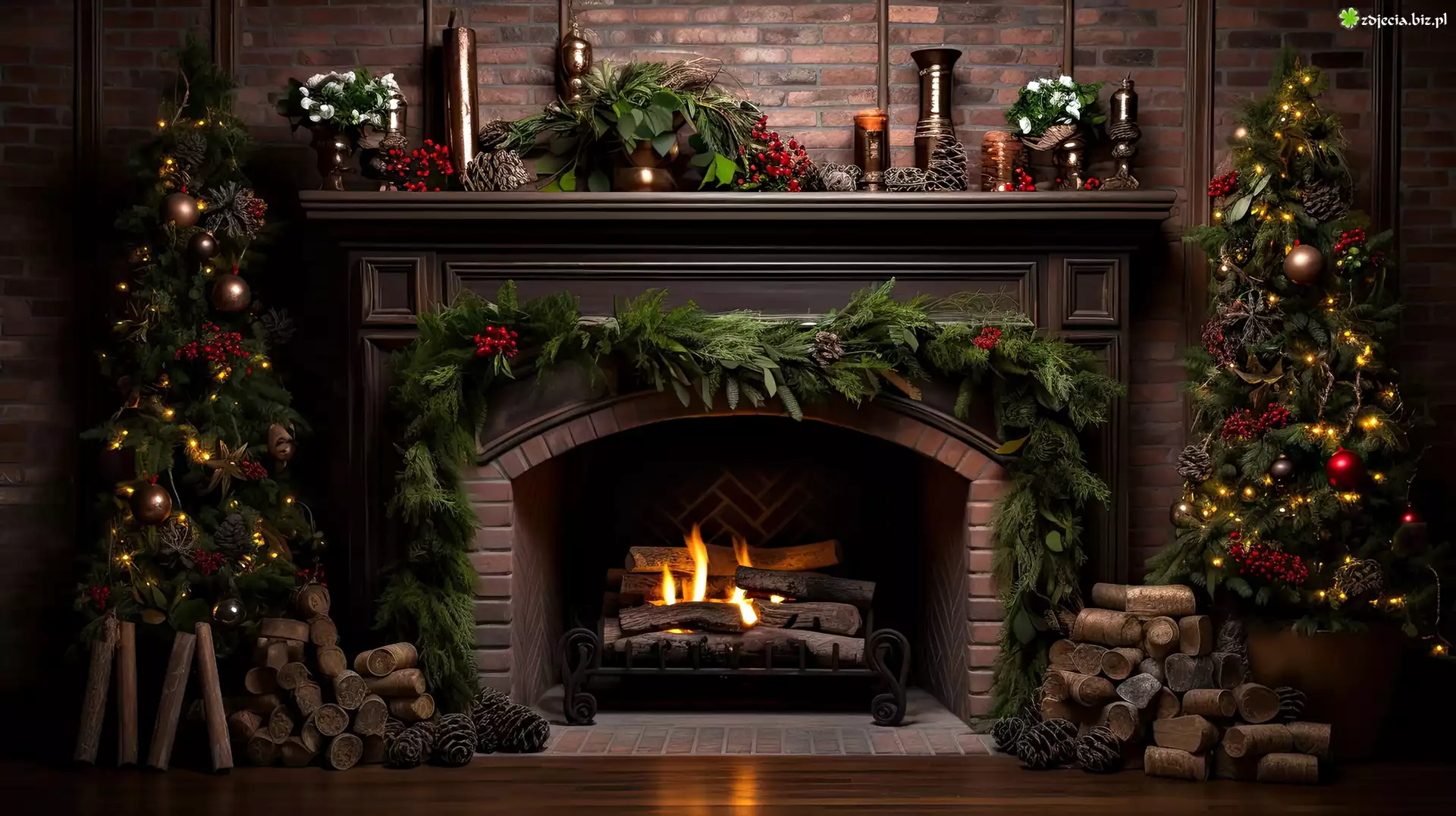 Zdjęcie, Choinki, Kominek, Dekoracje, Boże Narodzenie, Grafika AI