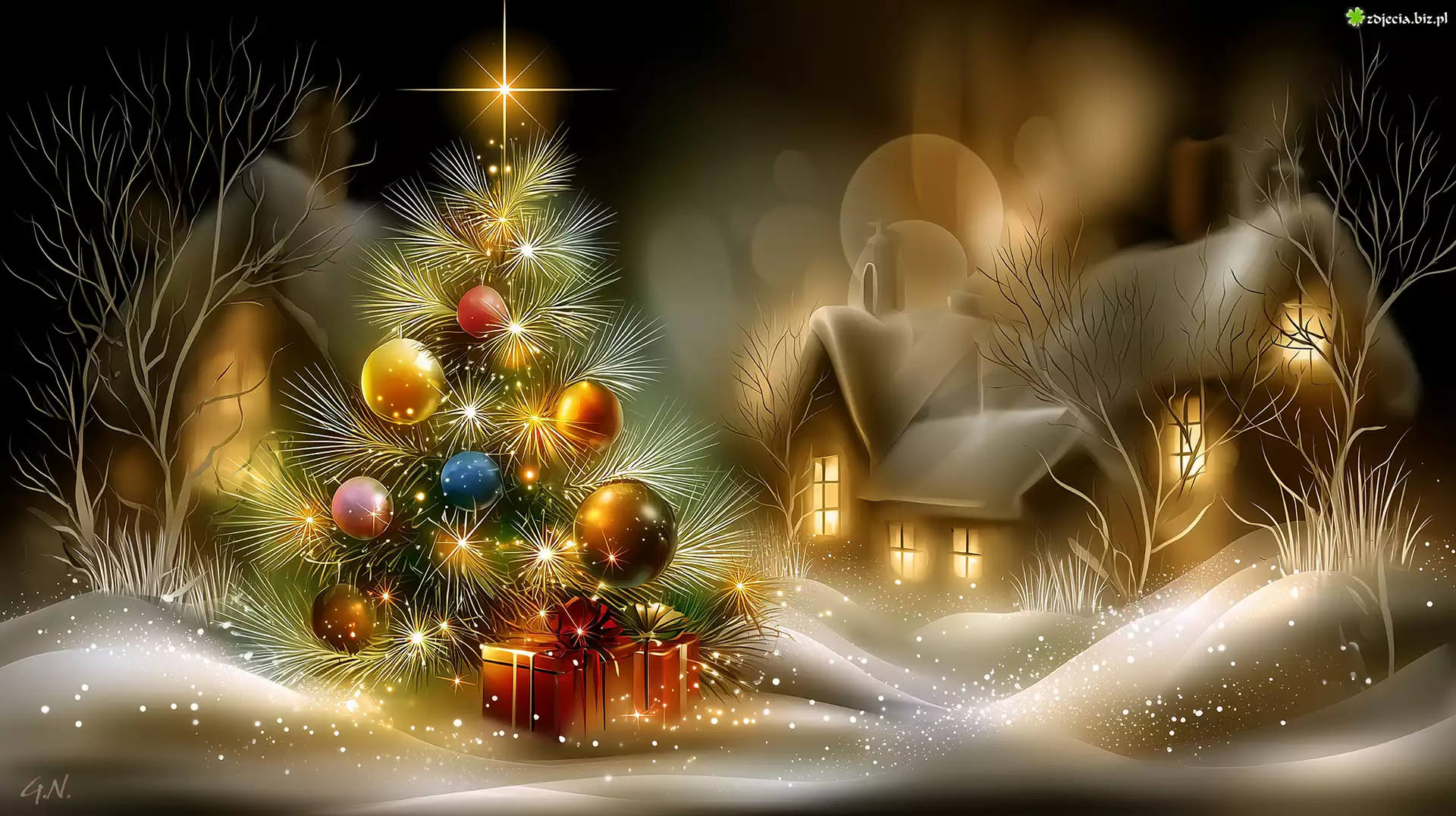 Zdjęcie, Boże Narodzenie, Choinka, Domy, Śnieg, Noc, Prezenty, Bombki, Grafika AI