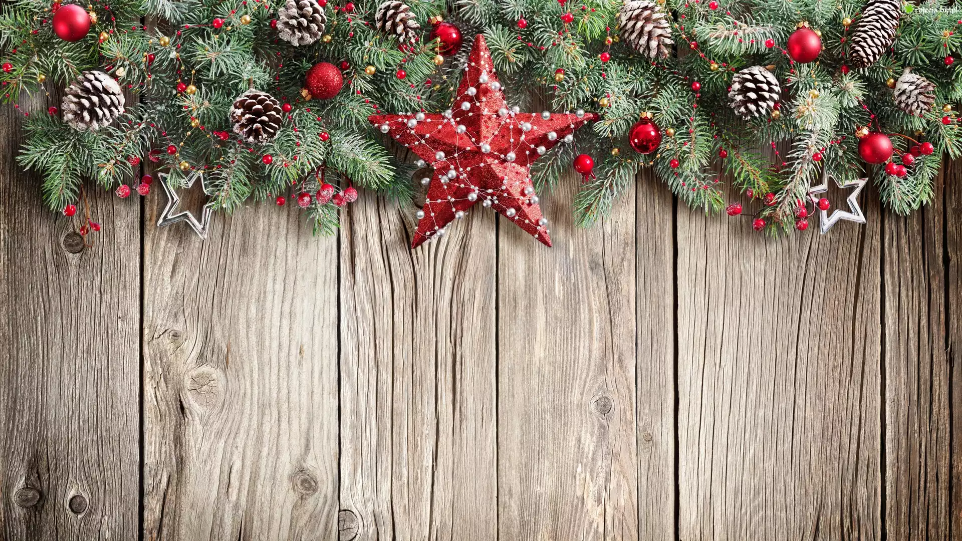 Zdjęcie Kompozycja, Boże Narodzenie, Gałązki, Czerwone, Bombki, Szyszki, Gwiazdki