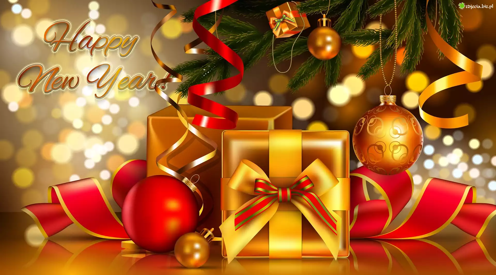 Zdjęcie Świąteczne, Boże Narodzenie, Noworoczne, Życzenia, Choinka, Bombki, Prezenty, 2D, Kompozycja |