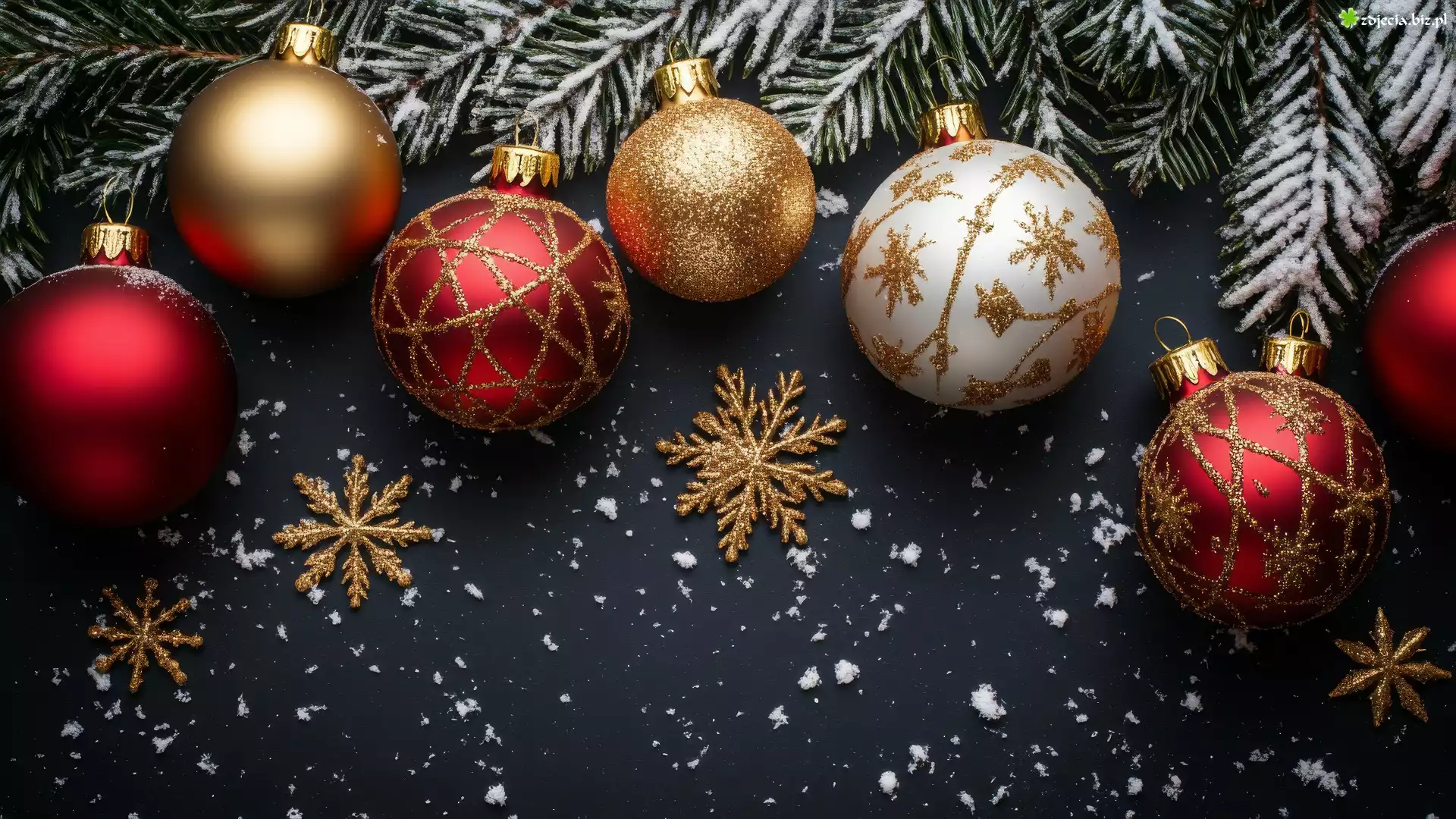 Zdjęcie Boże Narodzenie, Gałązki, Śnieg, Kolorowe, Bombki, Śnieżynki, Ciemne, Tło