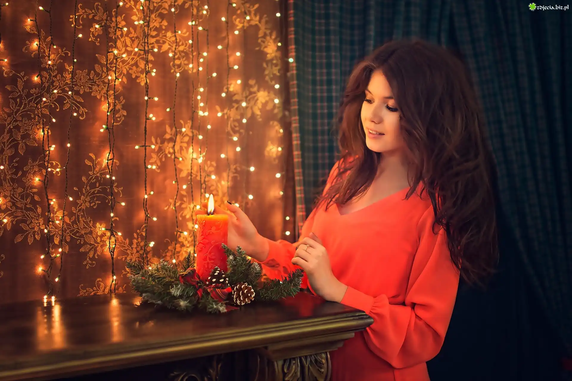 Zdjęcie Dziewczyna, Brunetka, Stroik, Świąteczny, Świeca, Oświetlenie, Wnętrza