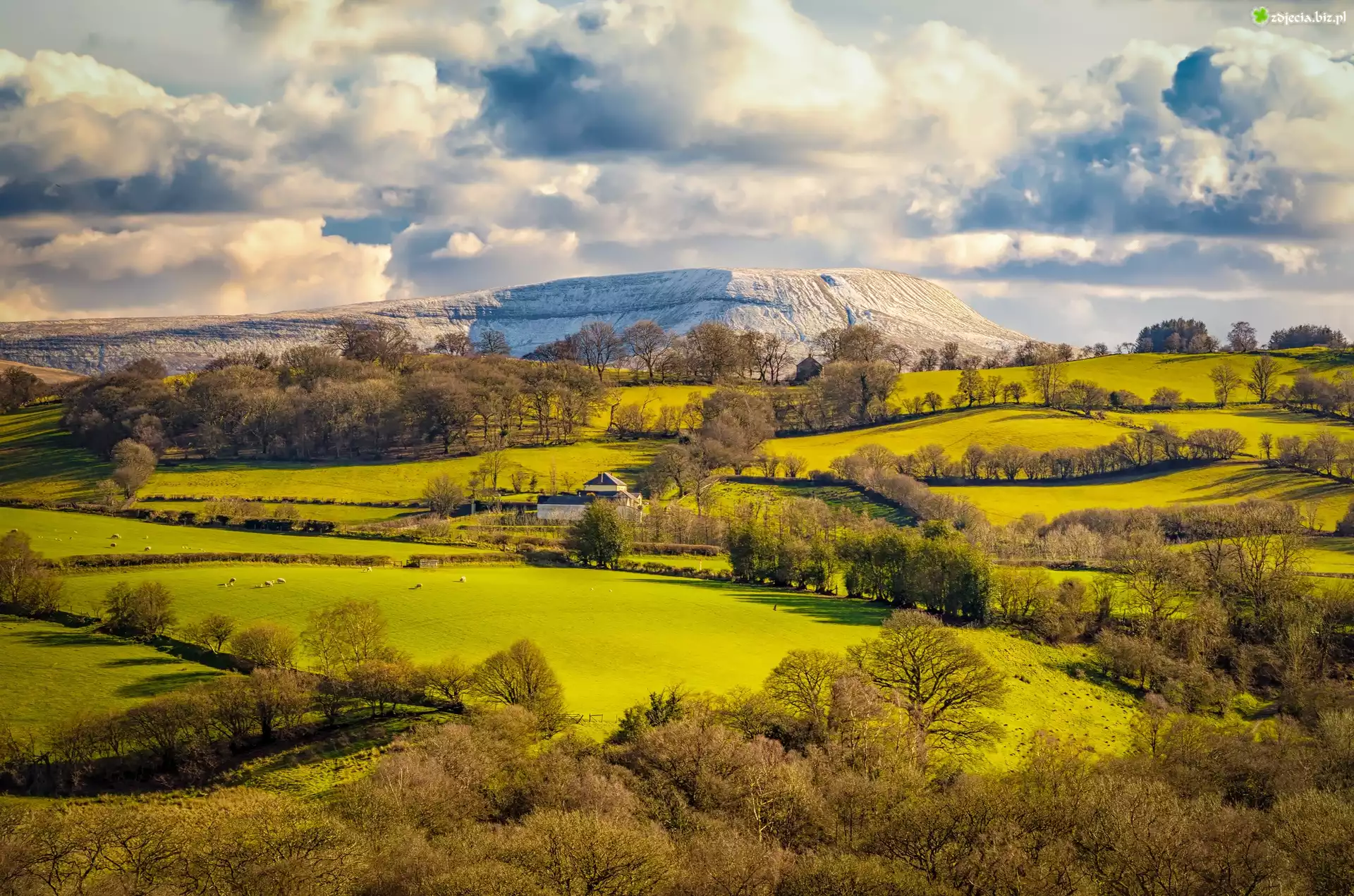 Zdjęcie, Wielka, Brytania, Pola, Wzgórza, Drzewa, Domy, Chmury