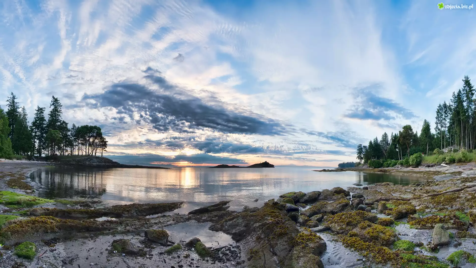Zdjęcie Kanada, Kolumbia Brytyjska, Wyspa Galiano, Morze, Wybrzeże, Drzewa, Chmury, Wschód słońca |