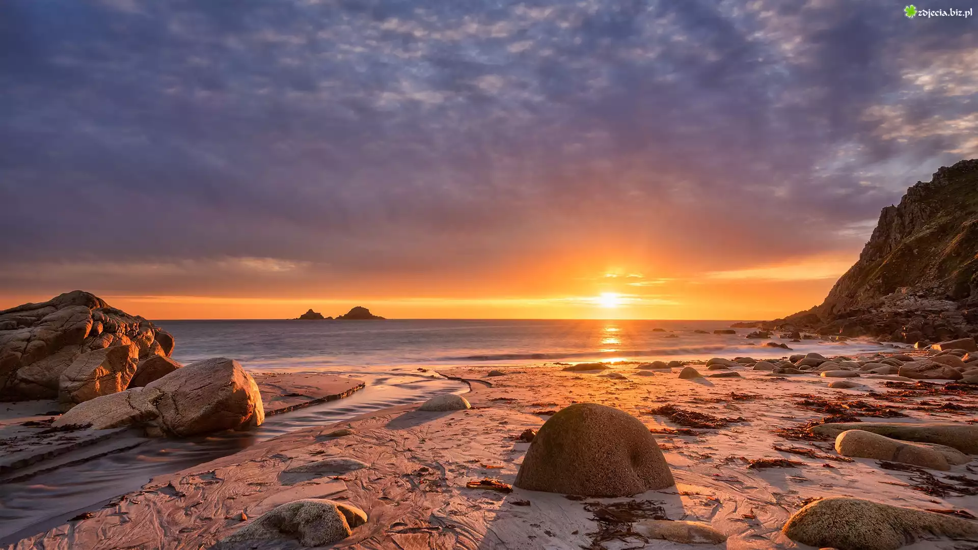 Zdjęcie Morze, Brzeg, Skały, Kamienie, Wschód słońca, Chmury