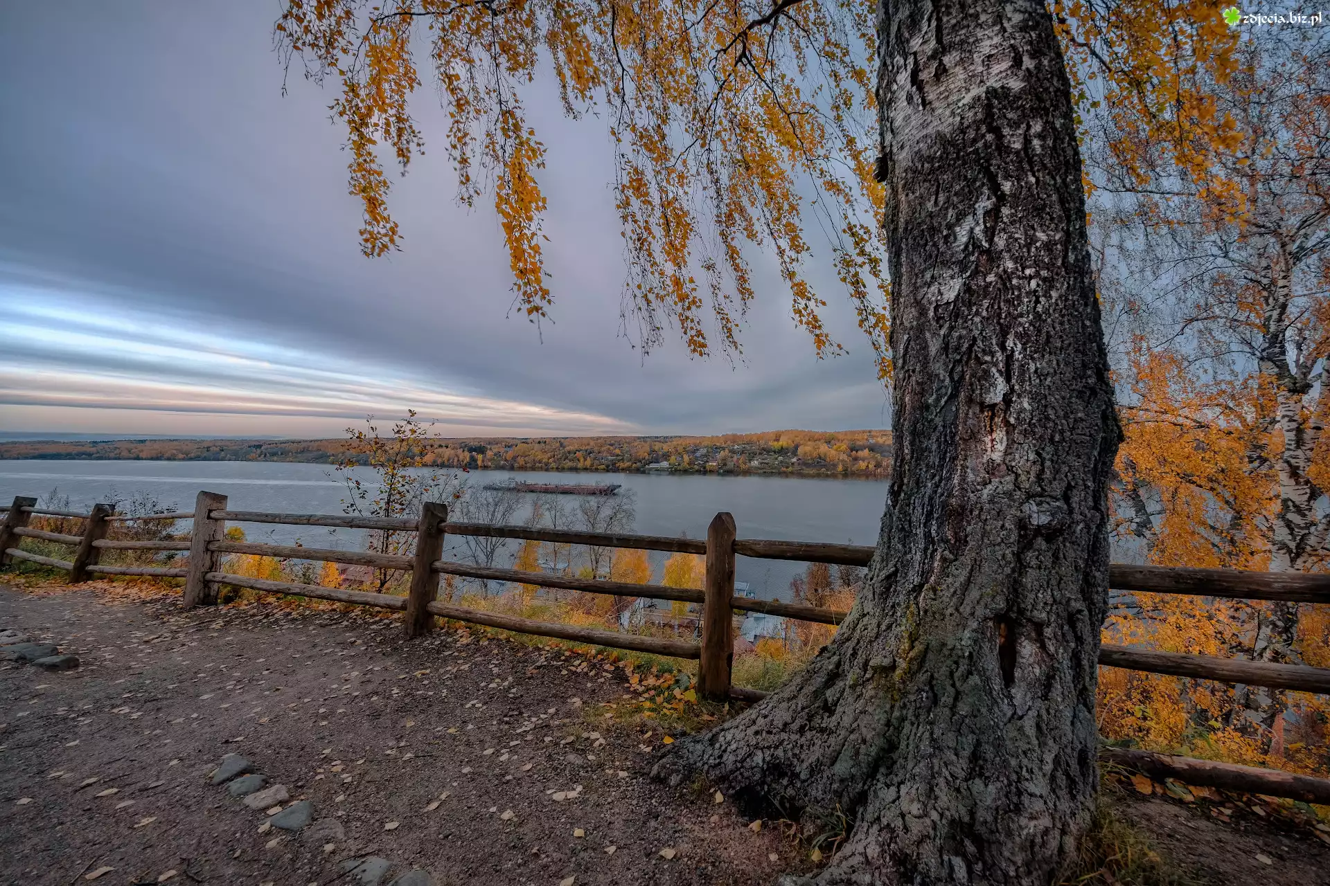 Zdjęcie Drzewa, Brzoza, Rzeka Wołga, Rosja, Ogrodzenie, Jesień