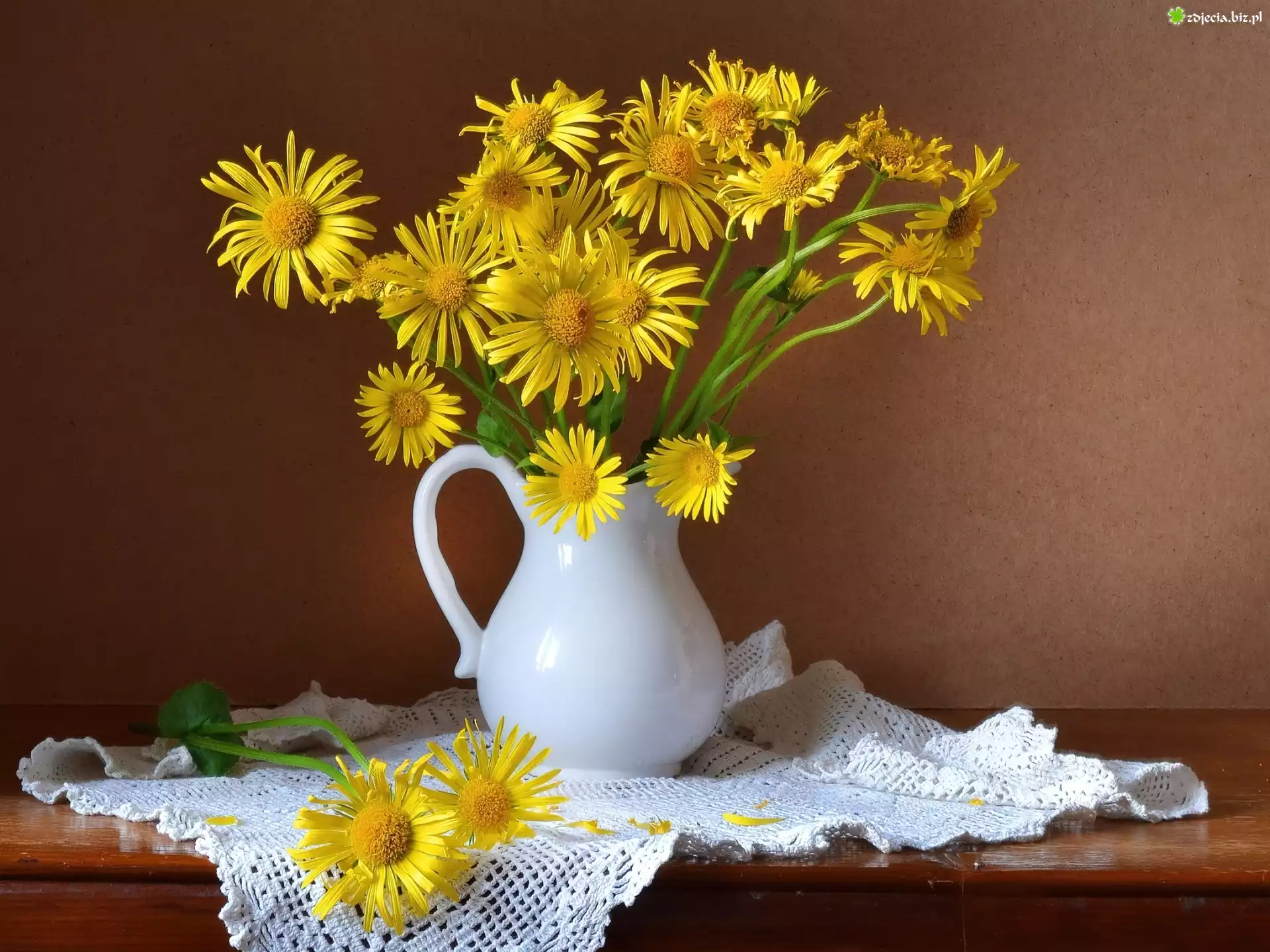 Zdjęcie Bukiecik, Żółtych, Kwiatów, Dzbanek, Serweta, Kompozycja