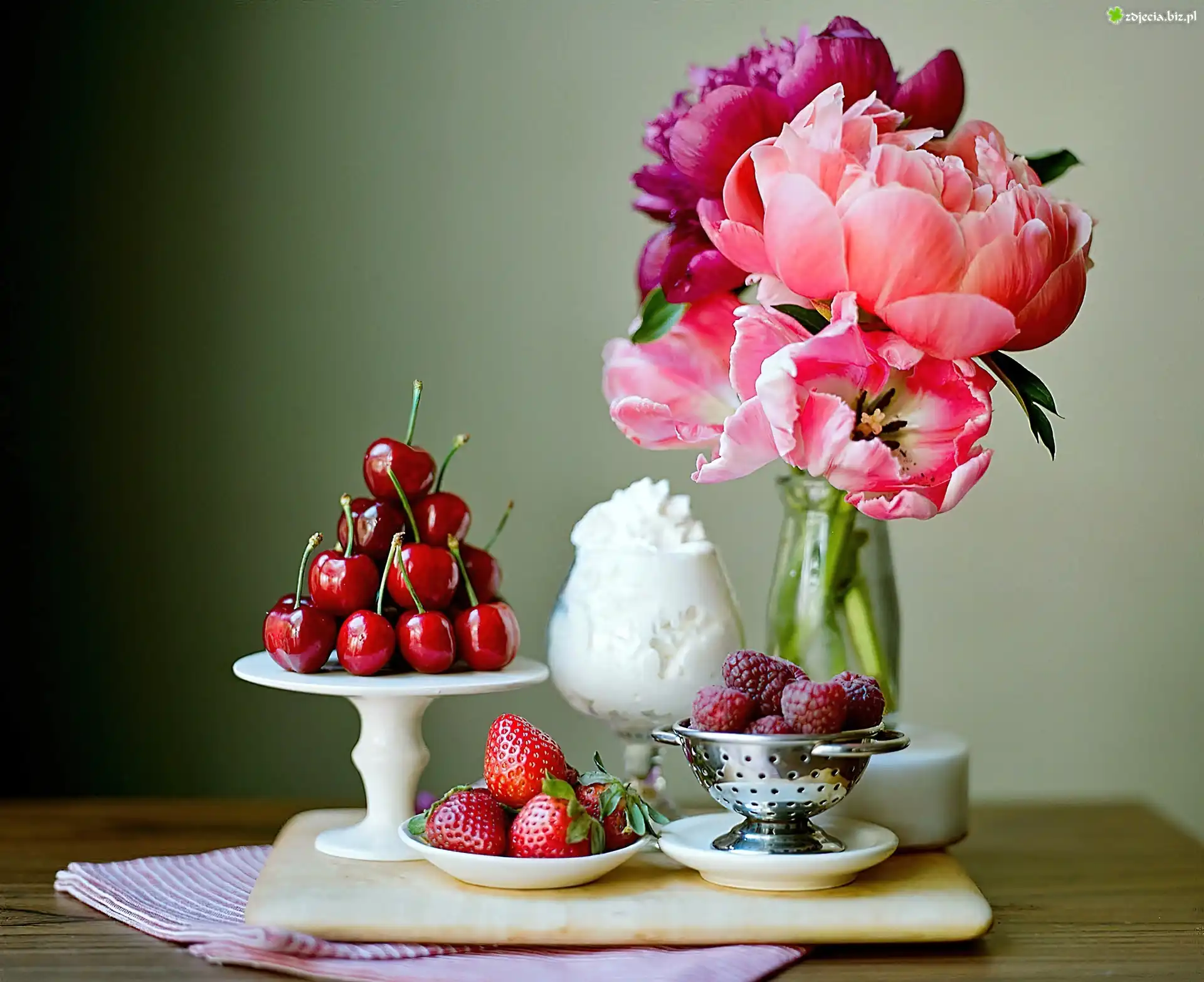 Zdjęcie Bukiet, Kwiatów, Owoce, Bita, Śmietana
