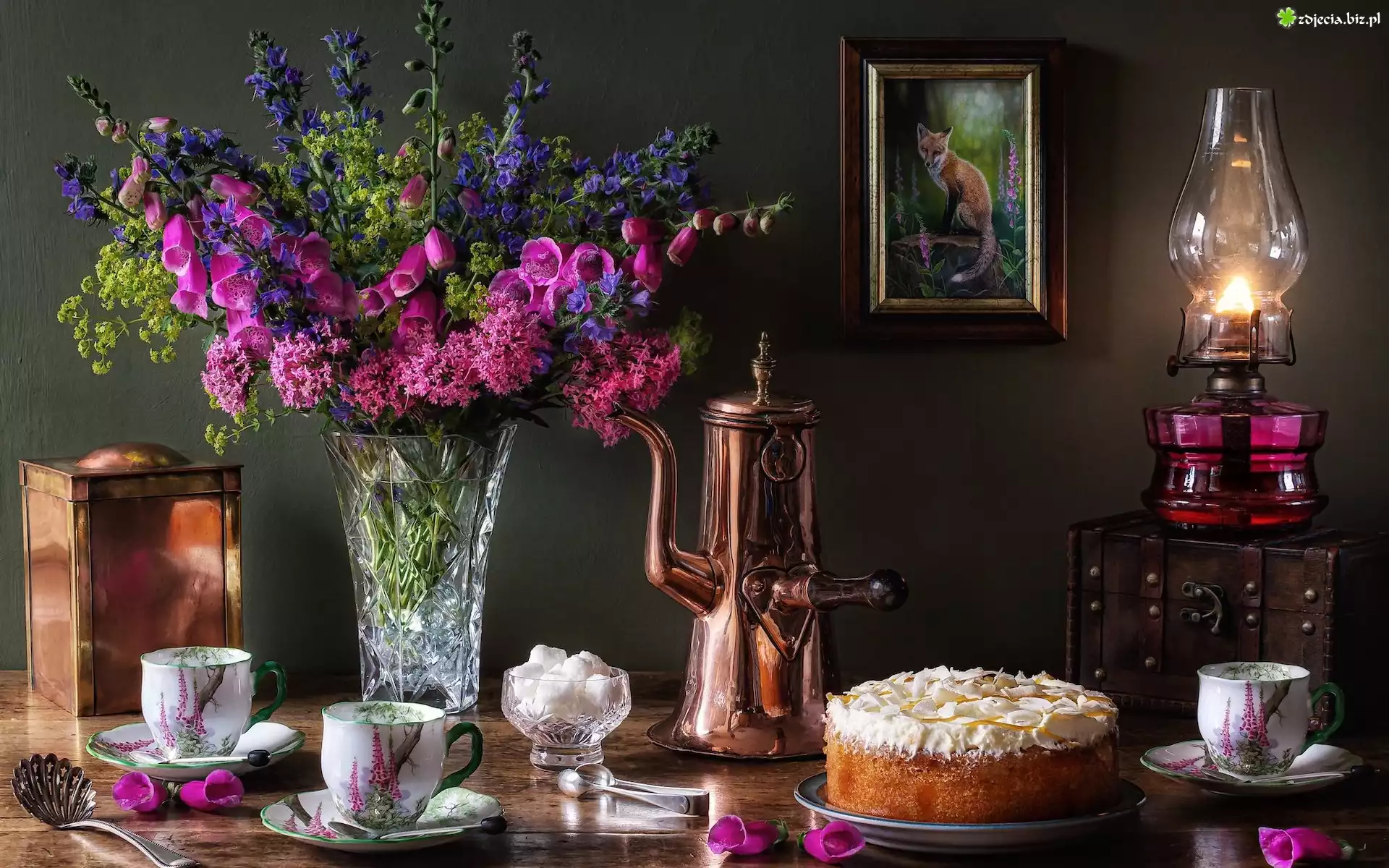 Zdjęcie Kompozycja, Bukiet kwiatów, Lampa, Obraz, Filiżanki, Dzbanek, Ciasto