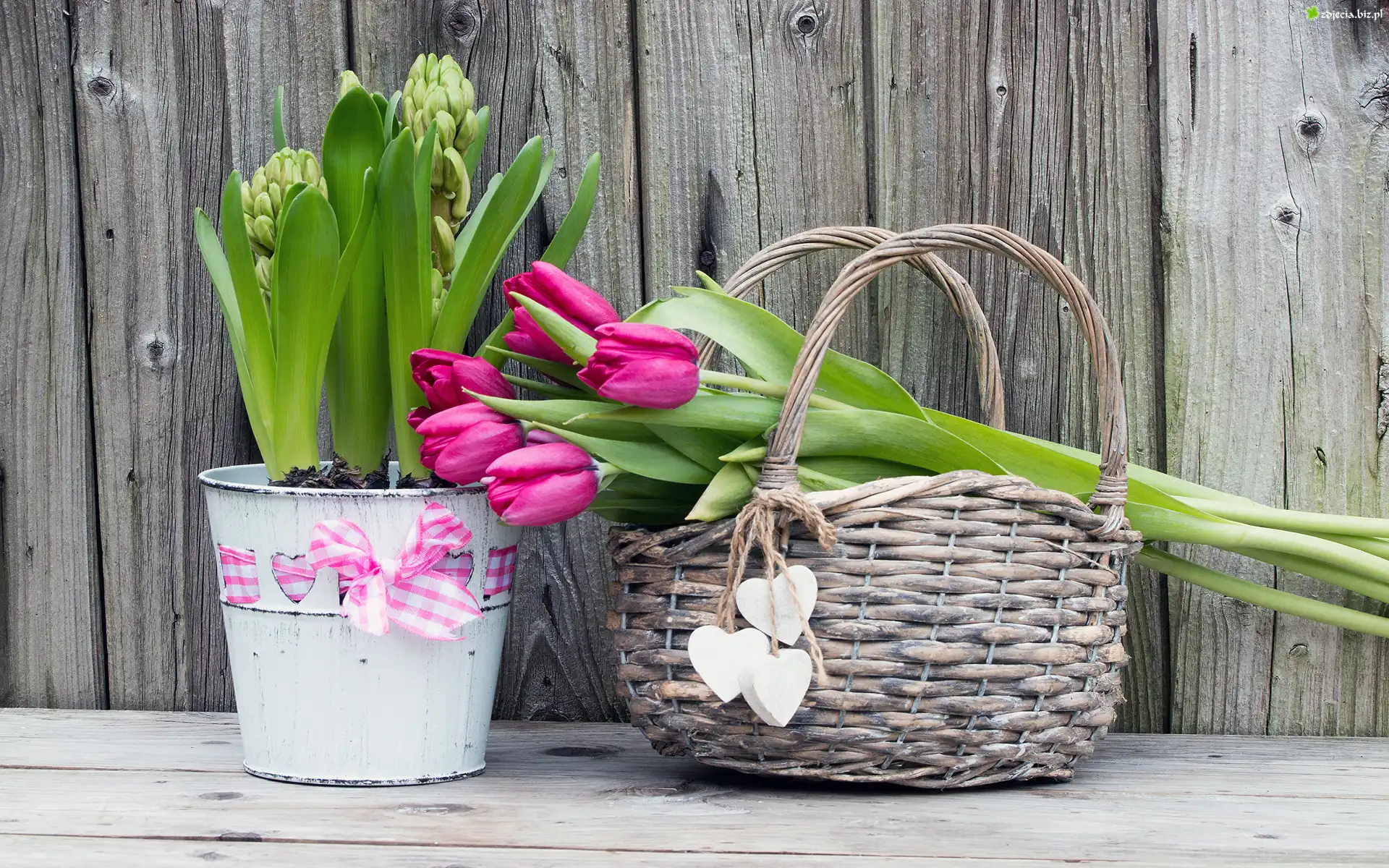 Zdjęcie Bukiet, Tulipany, Koszyk, Serduszka, Hiacynty, Wiaderko