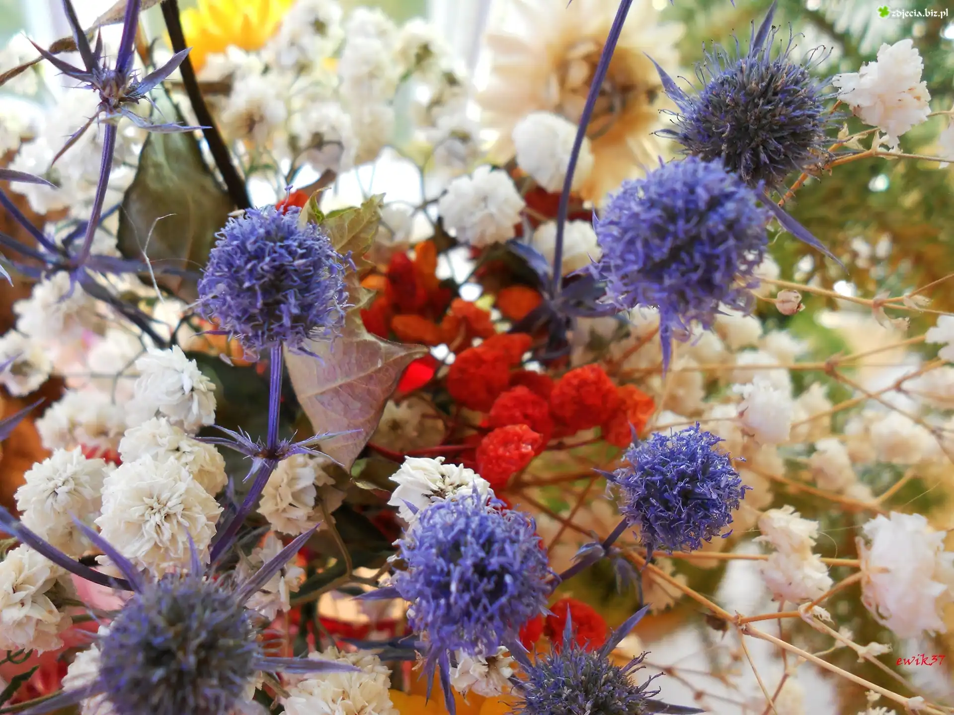 Zdjęcie Bukiet, Kwiatów, Niebieskie, Pompony, Jarzębina, Kocanka
