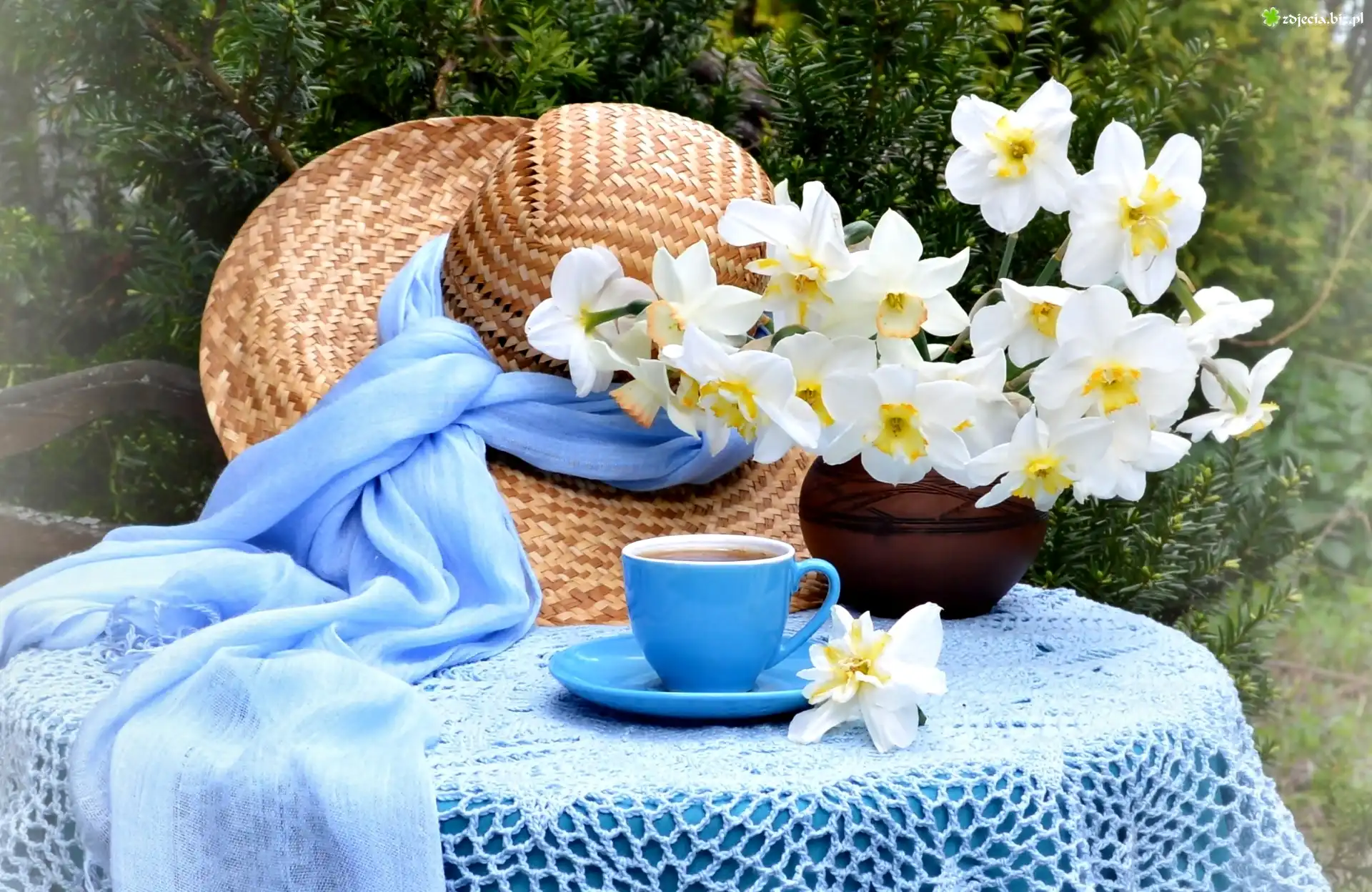 Zdjęcie Kompozycja, Bukiet, Narcyzy, Wazon, Kapelusz, Herbata, Filiżanka