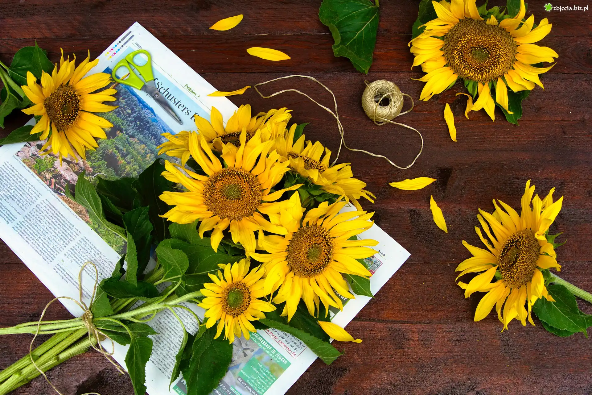 Zdjęcie, Kwiaty, Bukiet, Słoneczniki, Gazeta, Dekoracja, Sznurek, Nożyczki, Kompozycja