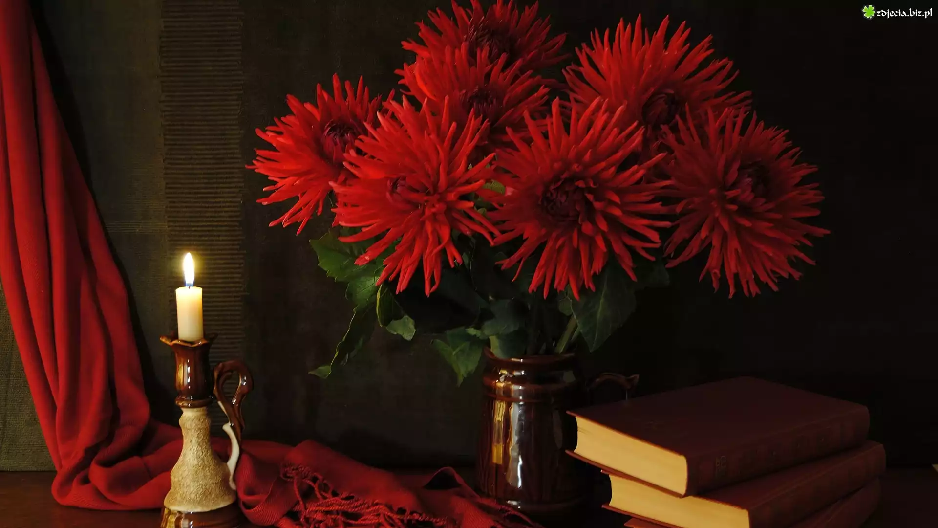 Zdjęcie Bukiet, Czerwonych, Kwiatów, Książki, Świeca, Kompozycja