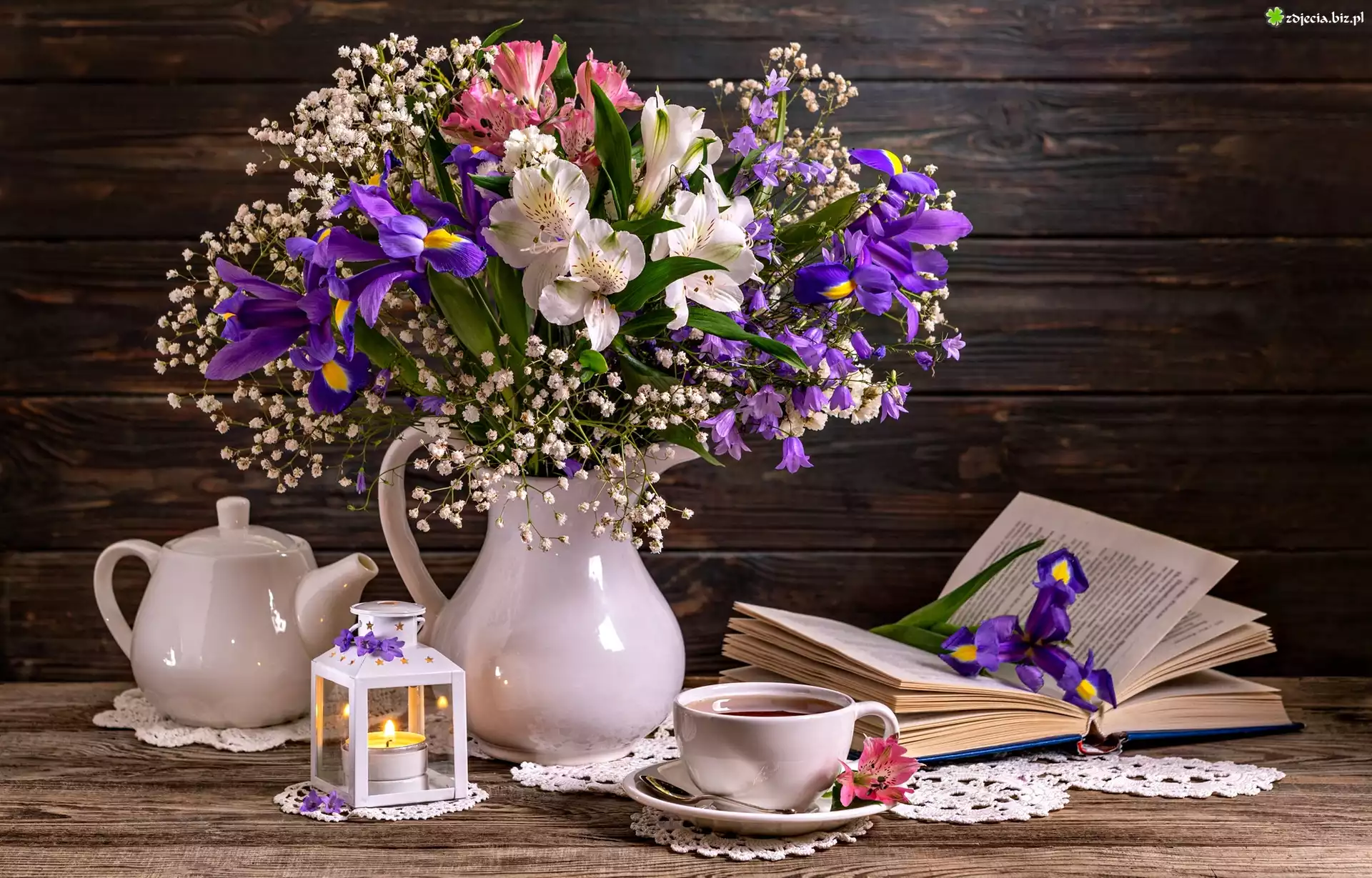 Zdjęcie Kwiaty, Bukiet, Dzbanek, Lampion, Książka, Filiżanka, Kompozycja