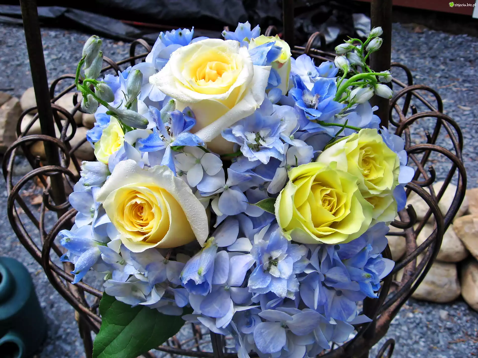 Zdjęcie, Bukiet, Żółtych, Róż, Niebieskie, Kwiatuszki