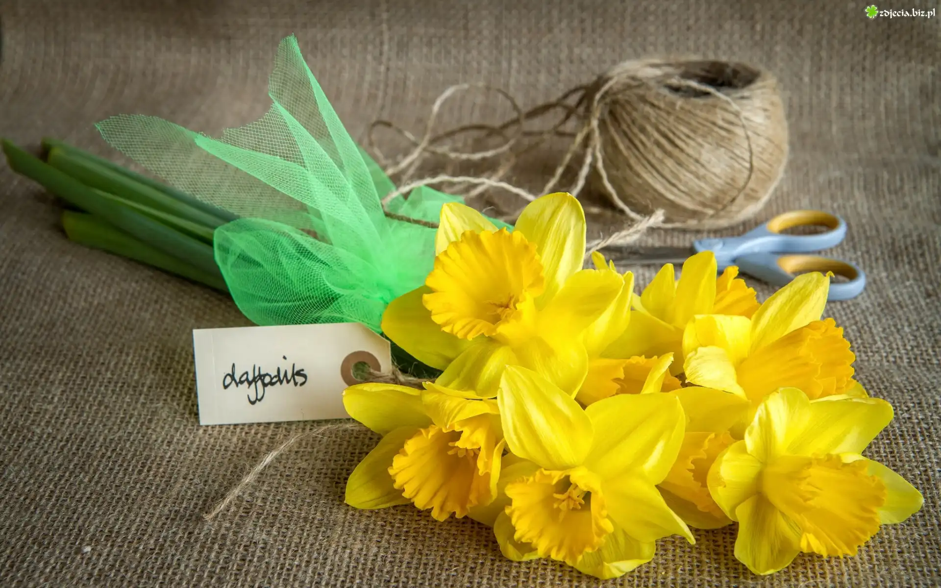 Zdjęcie, Bukiet, Narcyzy żonkile, Nici, Nożyczki, Kompozycja