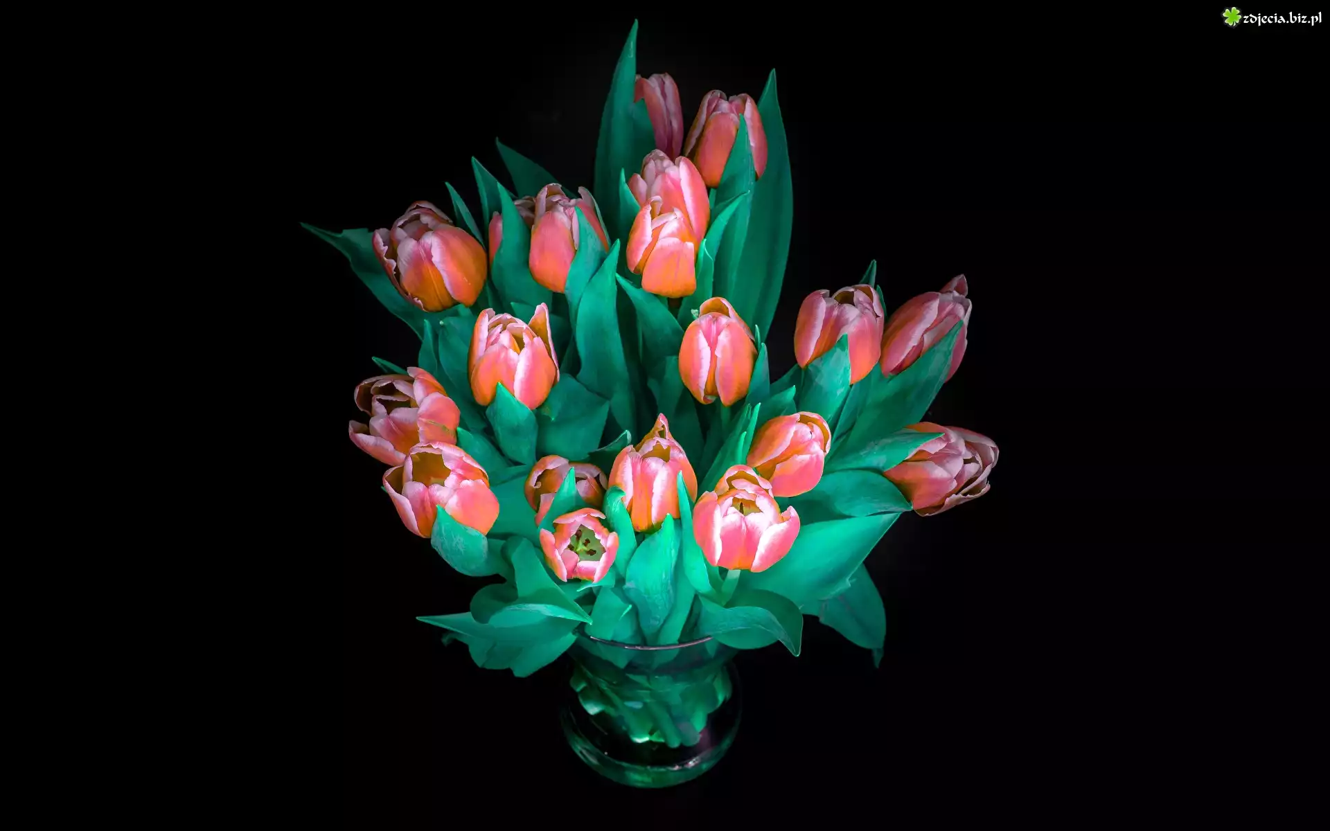 Zdjęcie Kwiaty, Bukiet, Czerwone, Tulipany, Szklany, Wazon, Czarne, Tło