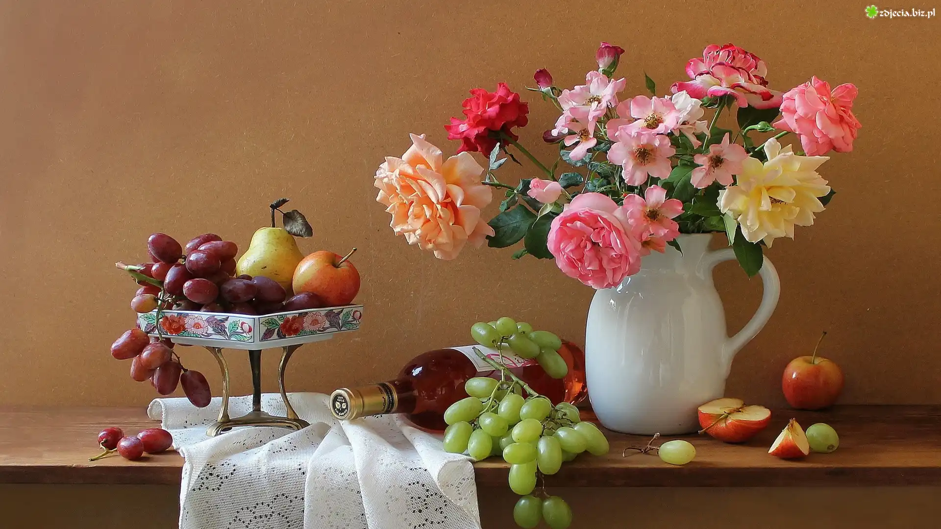 Zdjęcie Kompozycja, Bukiet, Róże, Owoce, Jabłka, Gruszka, Winogrona, Wino
