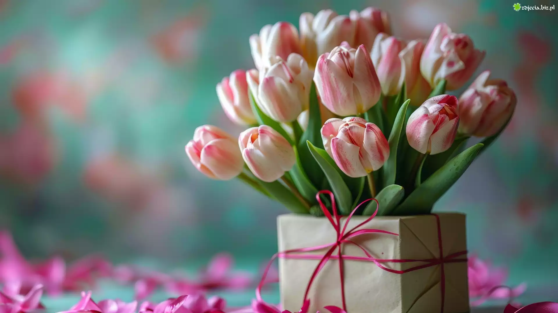 Zdjęcie Biało-różowe, Tulipany, Bukiet, Prezent, Wstążka