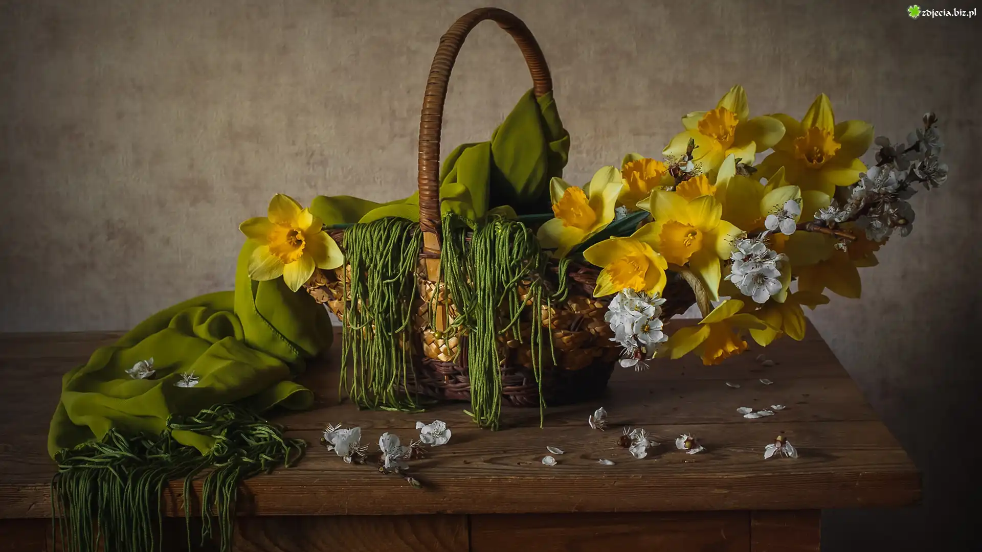 Zdjęcie Bukiet, Kwiaty, Żonkile, Kosz, Zielony, Szal