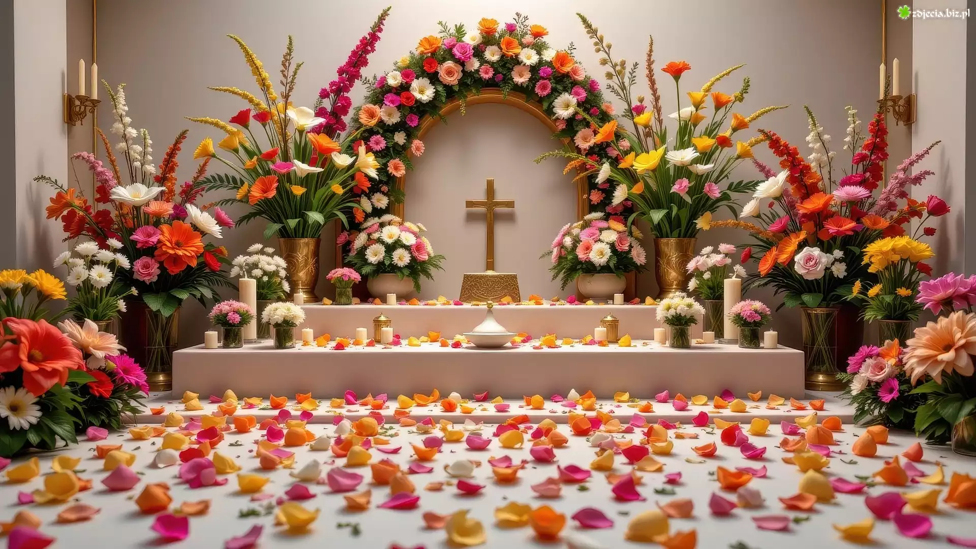 Zdjęcie Ołtarzyk, Krzyż, Świece, Bukiety, Kwiaty, Płatki, Kwiatów