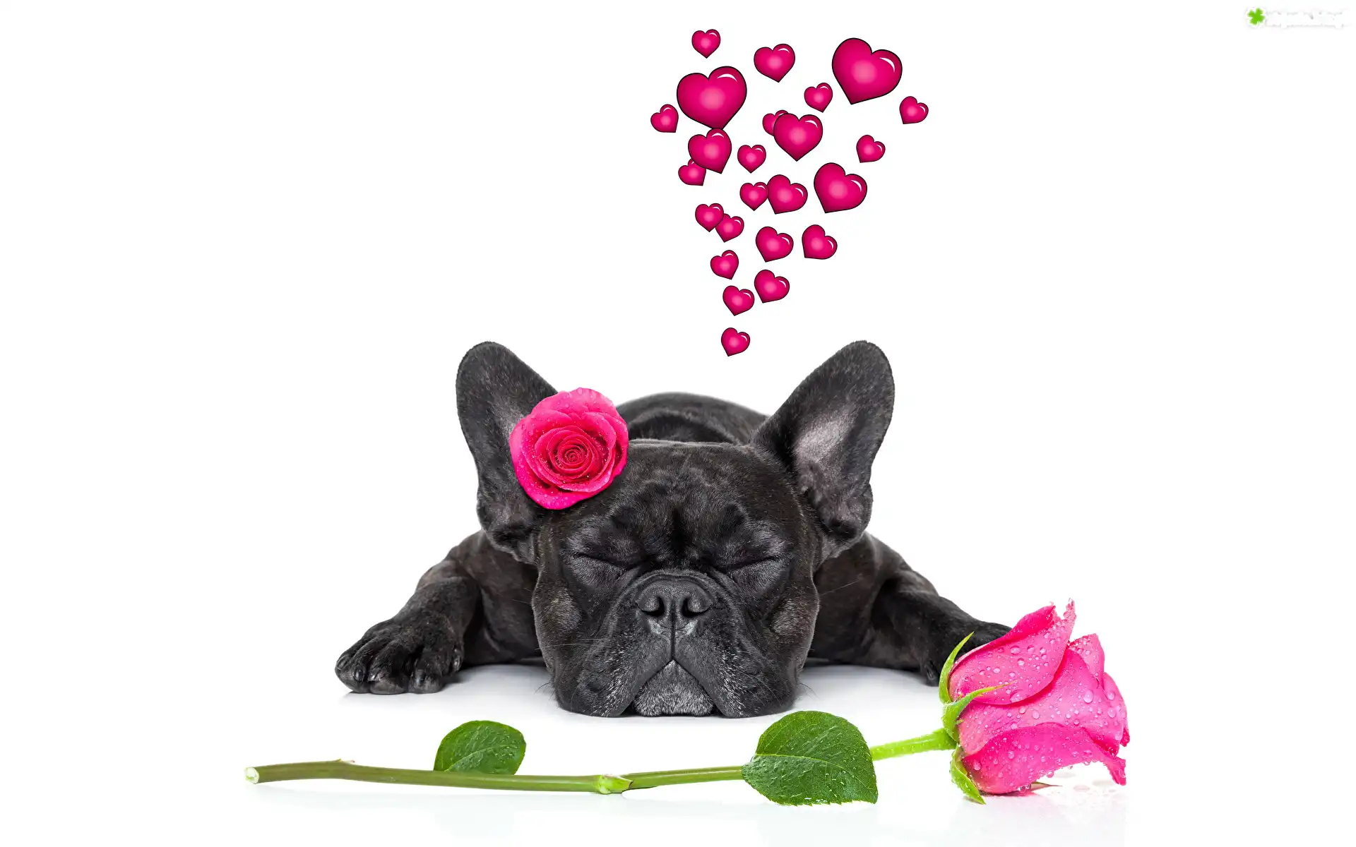 Zdjęcie, Pies, Buldog francuski, Zakochany, Kwiaty, Róże, Serca