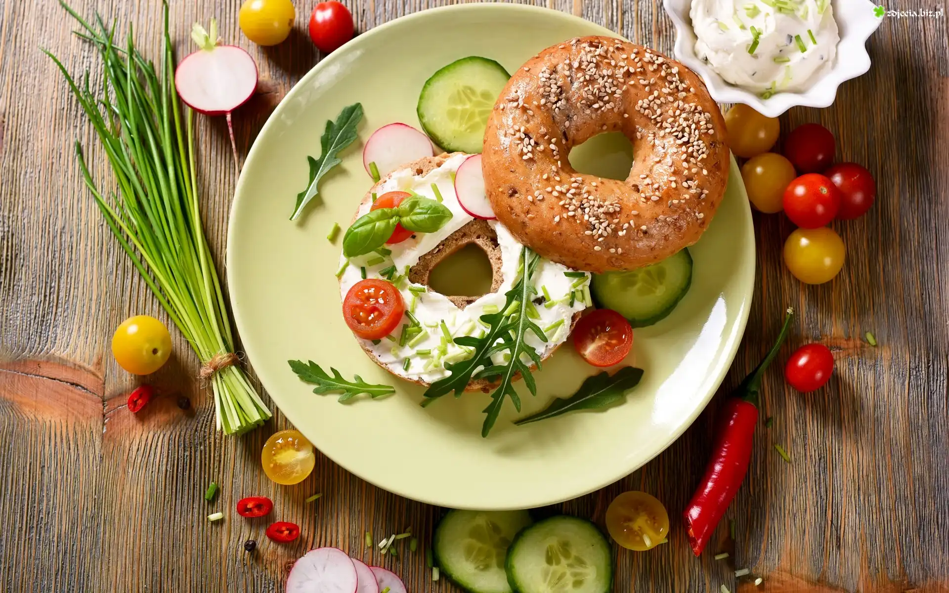 Zdjęcie Bułka, Kanapka, Talerzyk, Deski, Warzywa, Twarożek